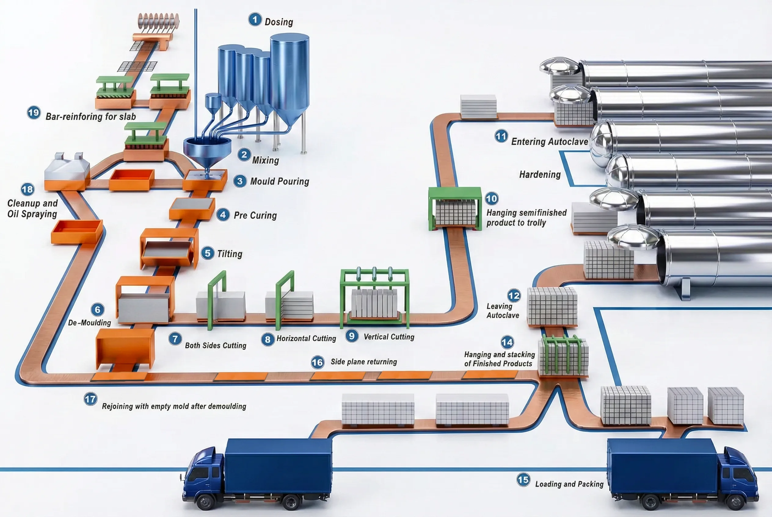 The first step in the manufacturing process of AAC blocks is the preparation of the raw materials. The materials used in the process are cement, lime, fly ash, gypsum, water, and a small amount of aluminium powder. The raw materials are mixed in the right proportions using a mixing machine.